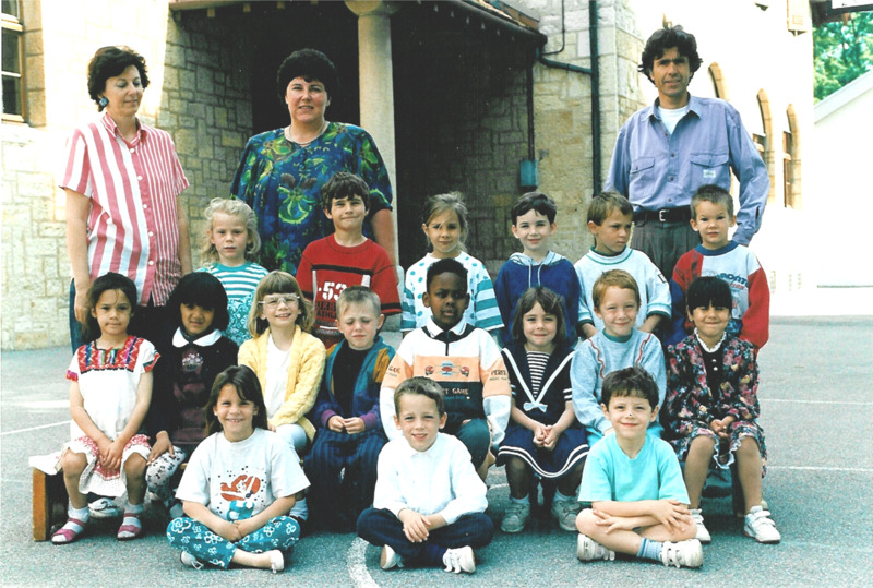 Copie d’une photo de la classe de Mme Marie-Claire Läng, qui est accompagnée de Mme Geneviève Wepf, professeur de musique et de M. André Nallet, professeur de dessin.