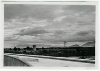 Photo PHO-B-0-182 Vue générale depuis le barrage de Verbois, avec dans le fond, le train à vapeur et plus haut, les villas neuves de Verbois. -