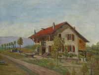 Photo PHO-B-0-95 Photographie d’un tableau de M. John DESBAILLET représentant le restaurant de la Chaumaz. Bâtiment représenté avant l’incendie qui le détruisit en 1924. -