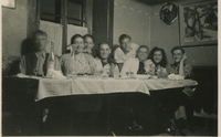 Photo PHO-C-J-7 Dans la salle à boire du café “Chez la Jeanne”, les membres de la Jeunesse. De gauche à droite : Raoul Monnier, La Jeanne Tremblet, Albert Kurer, Arnoild Desbaillet, Samuel Gillieron, Pierre Uldry, Renée Frund, André Plojoux,. -