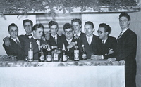 Photo PHO-C-J-8 La Jeunesse de Russin derrière le bar : De gauche à droite : Roland WANNAZ, Jules DUSSOIX, Albert HAUSLER, Marc HUTIN, Norbert DUFOUR, Henri BARRAUD, Marcel DESBAILLET, Raymond HUTIN, Guy DESBAILLET. Bal organisé par la Sté de Jeunesse pour la Saint-Sylvestre 1951. -