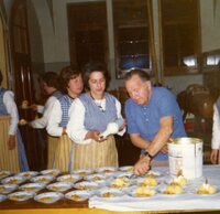 Photo PHO-C-P-11 Les paysannes de Russin préparent les desserts, dans le hall de la salle communale. De gauche à droite : Marie-Louise ZOSSO (Pépée) Juliette DUFOUR, Gisèle ZWAHLEN, Marguerite MONNIER et Paul MARCUARD. -