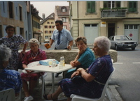 Photo PHO-C-P-10 VOYAGE EN GRUYERE. De gauche à droite : A l’arrière : Mme CHABLAIX . . . . . . . . . . . . . . . . . Andrée DILL Assis : Juliette METRAILLER, Henri BECK, Jeanine MALLET Devant : Noëlle METRAILLER -