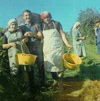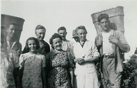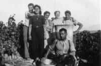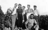 Photo PHO-D-0-27 Les vendanges chez PORCHET. Avec la brante, Pierre PORCHET. Les 5 personnes à l’arrière plan ne sont pas identifiées. -