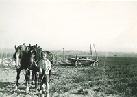 Photo PHO-D-0-3 Les chevaux Mousse (à gauche) et Fleurette (à droite) sont menés par un jeune garçon réfugié français, placé par la Croix-Rouge. (il est resté 3 mois à Russin) -