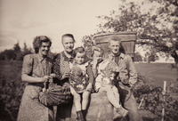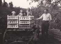 Photo PHO-D-0-35 Vendanges à Peissy, cueillette du raisin de table. Identification : de gauche à droite : Juliette , Isabelle , Michèle, Noëlle METRAILLER. Avec la brante sur le dos, un ouvrier agricole. -