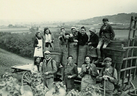 Photo PHO-D-0-9 Les vendanges chez Charles PENET. Devant le char, avec la brante sur le dos, Monsieur BARRAUD. -