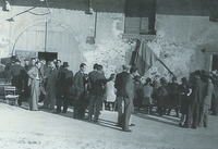 Photo PHO-E-A-39 Elections municipales de 1947. On prépare la fête de la victoire. Dans la Grnd-cour, de gaucher à droite : 1) . . . 2) . . . . 3) André PLOJOUX et l’enfant : . . . . . . . . . -