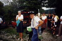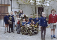 Photo PHO-F-0-16 Cortège du Feuillu (?) De gauche à droite : 1) . . . . 2) Alain DESBAILLET 3) Yvan GILLIERON 4) Sylvie LORMAND, 5) Yves GLATZ Assis dans le petit char : 6) . 7) Monique PORCHET Les 4 suivants : 8) Denis GIRARDET 9) Eric PORCHET 10) Michel DESBAILLET 11) Diane LORMAND Lieu : dans la cour du Château Fazy