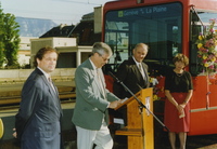 Photo PHO-E-G-35 Baptême de la rame RER “La Grôle” en gare de Genève-Cornavin. De gauche à droite : Patrice PLOJOUX, maire de Russin M. ANET, représentant des CFF , Gérard RAMSEYER , conseiller d’état et Noëlle VUADENS, adjointe à Russin -