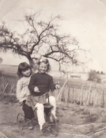 Photo PHO-H-0-103 De gauche à droite, Michèle et Noëlle METRAILLER sur leur tricycle, au milieu des vignes du Mandement. -