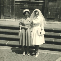 Photo PHO-H-0-114 Mademoiselle Monique RUDOLPH, le jour de sa première communion, elle est accompagnée de Madame BABEL, (épouse du Pasteur). Temple de la Fusterie, le 29 mai 1960. -