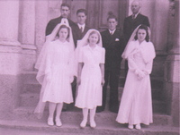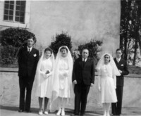 Photo PHO-H-0-112 Première communion. Devant le Temple de Dardagny, les garçons : Norbert DUFOUR, M. le pasteur Roger BENOIT, Georges KOHLER. Les filles : Nelly HUTIN, Georegette VOIRIER. -