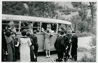Photo PHO-H-0-133 Noce Joseph DUGERDIL - RAMU, le 30 août 1941. Près de la Chapelle de Malval, invités à la noce devant et à l’intérieur de l’autocar qui va les transporter. -