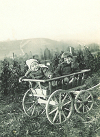 Photo PHO-H-0-8 Promenade du côté d’Avully, assis dans le petit char, Claude et Gabriel GIRARDET. Dans le fond, la Donzelle. -
